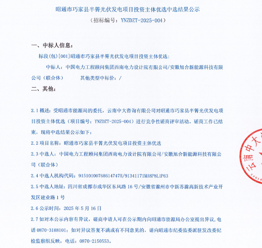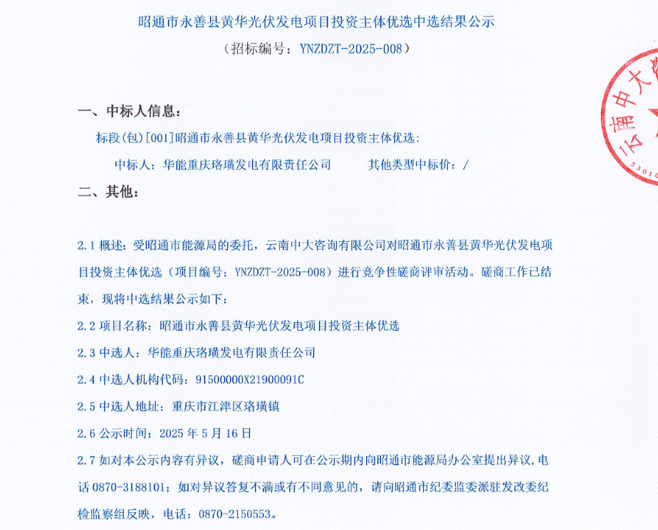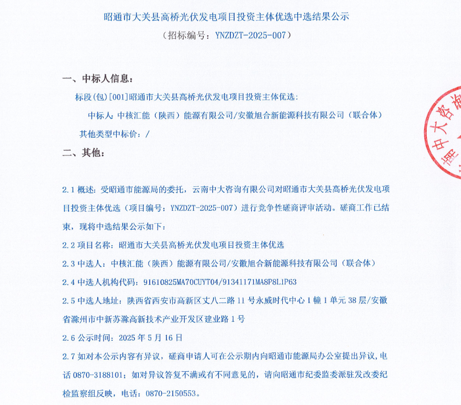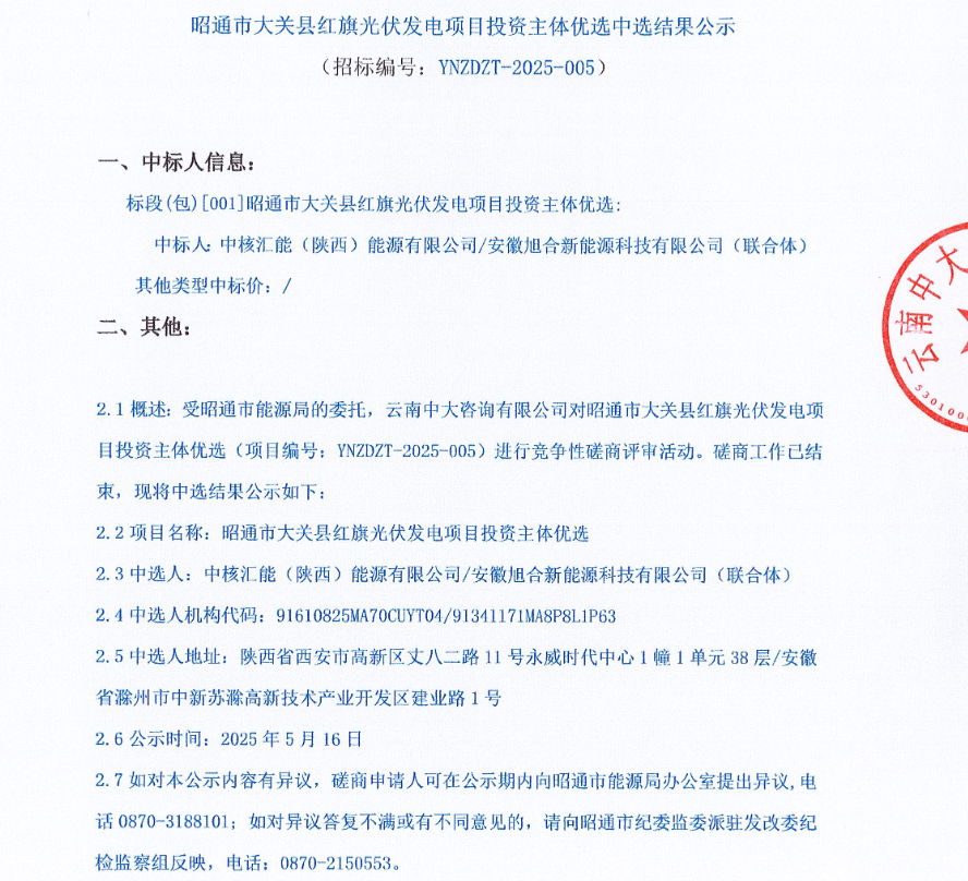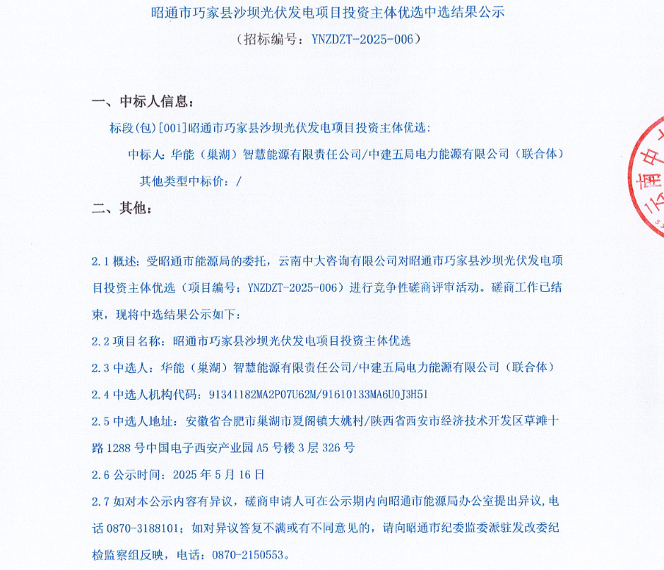 5月15日,云南省昭通市公布了5个、规模为51万千瓦的光伏项目竞配的中标情况(中标文件见附件),被中核、华能、中能建的下属企业获得。