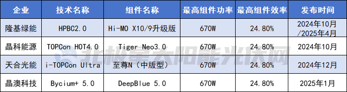 实际上,除市占率外,四大组件寡头的护城河更是建立于技术领先。2024年下半年,技术迭代风暴口,隆基率先推出基于HPBC 2.0技术的全新组件新品Hi-MO X10,将组件量产效率拉高至24.8%。紧随其后,晶科、天合、晶澳纷纷官宣新品,同样追至24.8%。