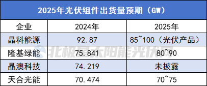 只是产能供需矛盾未解,行业周期底部挣扎之下,头部企业也难逃亏损命运。2024年度,除晶科保持盈利外,其他三巨头净利润均大幅亏损。今年一季度,四大巨头净利润更是无不为负。由此,对于2025年组件出货目标,晶科、隆基、天合仅预期同比微涨。
